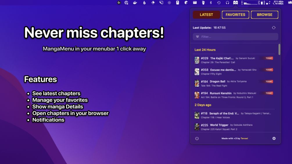 MangaMenu is a macOS menubar app that regularly checks MangaPlus for updates to your favorite manga and notifies you if there are any.
